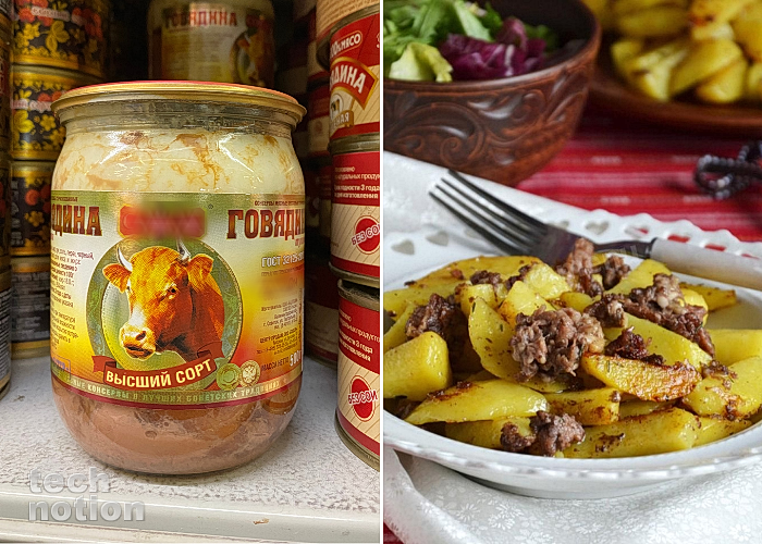 Рецепт предельно прост. Картошку чистили, нарезали крупными кубиками и отправляли на плиту. Когда она была доведена до полуготовности, к ней добавляли всё содержимое банки тушенки. «Белый жир» тоже шел в ход. Советские хозяйки его ни в коем случае не выбрасывали.