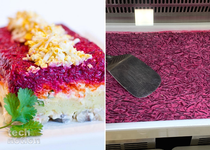 В советское время в этот салат шли самые привычные ингредиенты: отварная свекла, картошка, морковь и селедка. Фишка блюда в том, что продукты укладывались слоями, каждый из которых от души промазывался майонезом. Порядок такой: селедка, морковь, картошка и свекла. У опытных хозяек даже есть хитрость, позволяющая соблюдать идеальные пропорции. Звучит она так: каждого овоща должно быть столько же, сколько селедки.