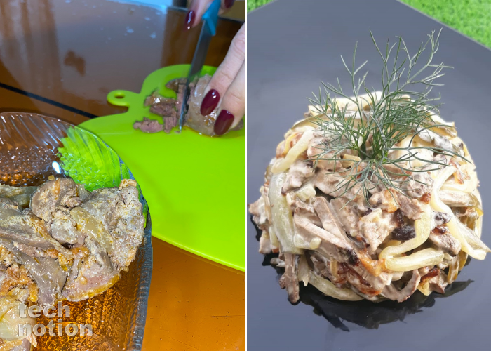 Для создания блюда нужны были три бюджетных продукта: говяжья печень, соленые огурцы и лук. Повар всё нарезал, перемешивал, добавлял соль и перец и щедро поливал майонезом. На 500 г печени требовалось столько же лука и 250 г огурцов.