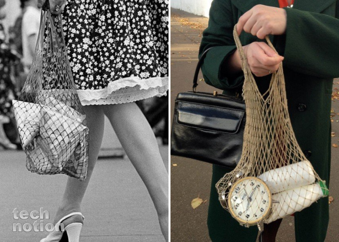 Во времена дефицита в СССР стали набирать популярность сетчатые сумки-авоськи. Их носили с собой на всякий случай, вдруг по дороге домой нужно будет что-то купить из продуктов. Преимуществ у таких сумок было несколько: они легкие, в сложенном виде занимают мало места, а выдерживают без малого 70 килограммов. Неплохо, да?