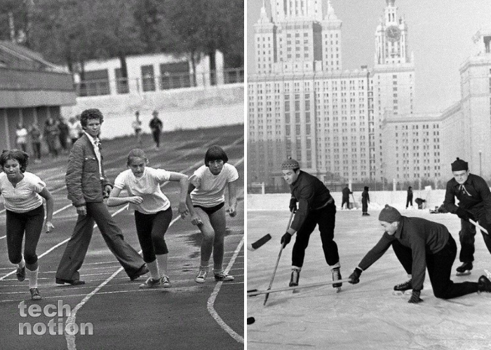 Советские власти активно пропагандировали спорт и здоровый образ жизни. И у них это прекрасно получалось. Дворовые атлеты крутили «солнышко» на турниках под открытым небом, дети играли в догонялки, советские женщины занимались аэробикой по телевизору, а мужчины бегали по стадионам.