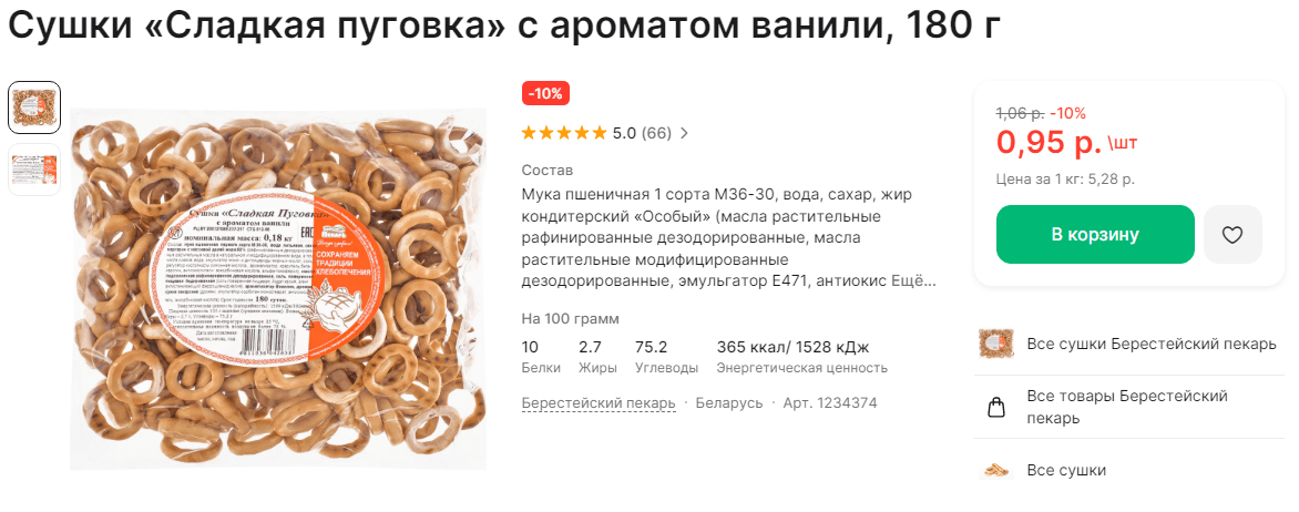 Сушки (180 г) – 0,95 BYN (на акции). Обычная цена – колеблется от 1,26 до 1,7 BYN.
