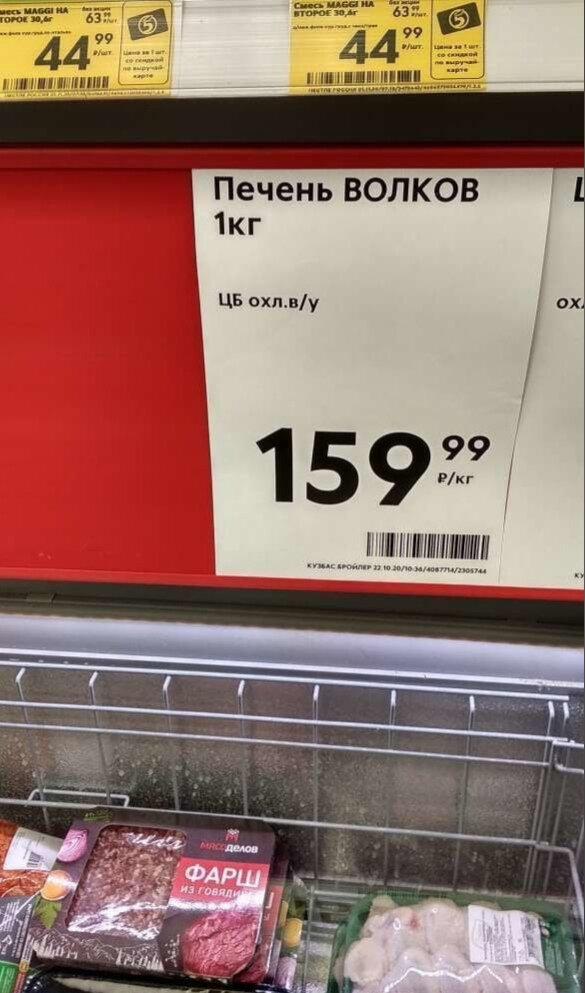 Вот, к примеру, Печень ВОЛКОВ (ценник из Пятерочки) — все ли сразу поняли?