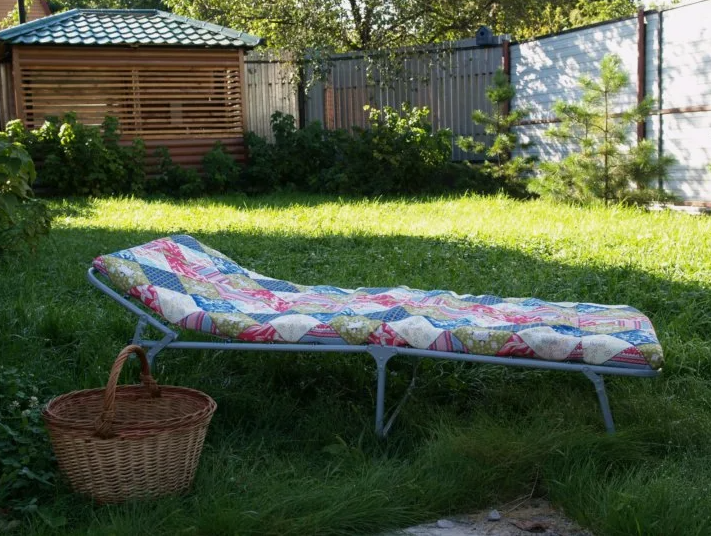 На раскладушке можно и в комнате дома расположиться и на чердаке. Ну а если в очередной раз разошлись взгляды с супругой, то и во дворе можно устроить лежбище…