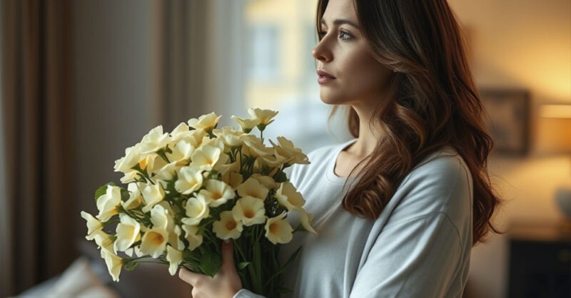 Как он протянет ей букет, поцелует и произнесет: «С 8 Марта, родная.»