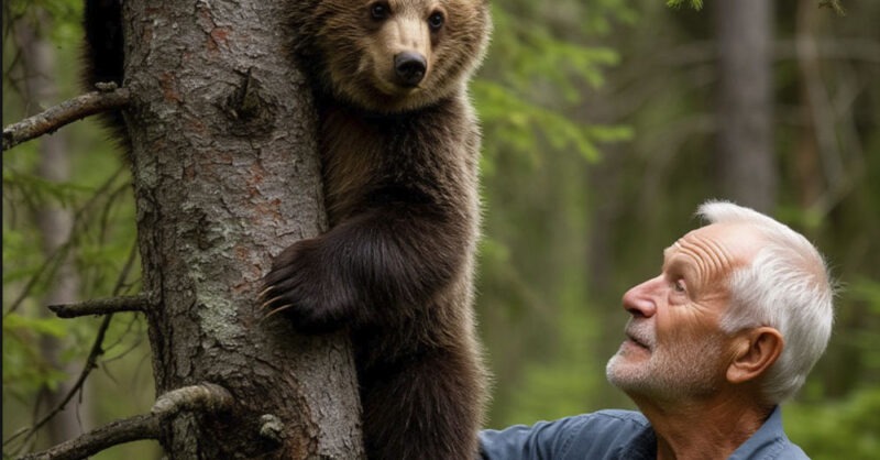 У дерева они остановились. Медвежонок был высоко — метрах в трёх-четырёх. Верёвка, истёртая и грязная, запуталась в его лапах. Он дергался, но без паники — больше от беспомощности, чем от страха.