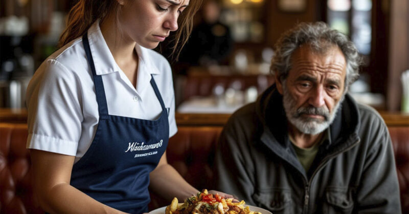 Когда из кухни вынесли блюда, Настя машинально взяла заказ для пожилой пары… и понесла его мужчине у окна. Только поставив перед ним дорогие блюда, она осознала, что всё перепутала.