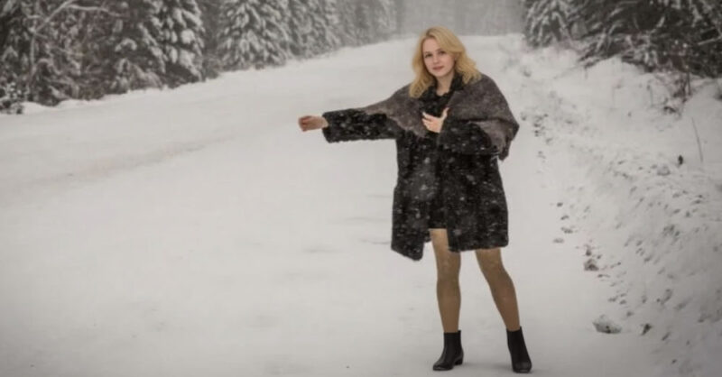 Вероника, дрожащими руками, надела шапку, накинула шаль, выбралась из высокой кабины и осталась стоять на краю дороги, затерянная между белым полем и черной стеной леса. Кругом не было ни души, только изредка прорезывали тишину одинокие лесовозы.
