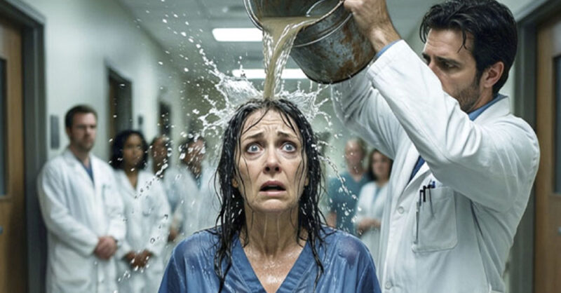 Кадр замер. На экране — летящая вода и лицо женщины, на которое она обрушивается.