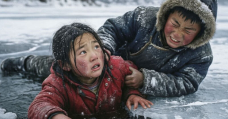 Картина, открывшаяся ему, была одновременно ужасающей и величественной. На краю темной полыньи, похожий на застывшую скульптуру, стоял Артем. Он склонился над водой, его шея была напряжена, а глаза, широко раскрытые, смотрели вниз, на сестру. Он не плакал, не звал на помощь. Он просто держал. Держал изо всех сил, которые только могли жить в его маленьком теле. Оба ребенка были бледны, а губы Артема посинели от нечеловеческого усилия.